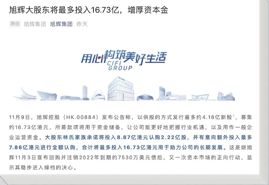 一周后,好消息再度传来。大股东林氏家族承诺将最多投入16.73亿港元用于助力公司长期发展,在当下充满挑战的市场环境下,这一强力注资不但有利于旭辉稳健进入绿档,更能助力旭辉集团以从容的姿态,蓄力下一阶段的高质量发展。