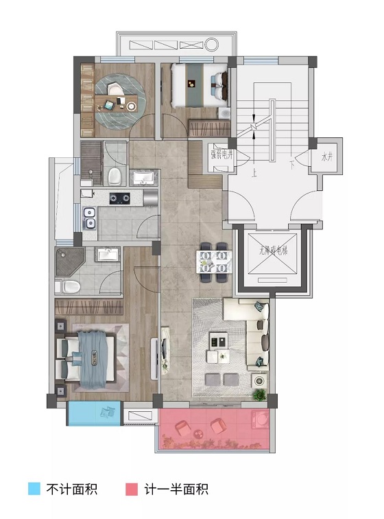 特别提示:本资料所有未作特别说明的面积均为约数,所有图文仅供参考,不构成要约内容。所示彩色家配图仅作为该户型平面布局的装修示意,非实际交付标准,本项目为毛坯交付。相同户型因楼栋、楼层、单元的不同,局部结构、面积可能有所不同,具体尺寸、形式存在差异。具体房屋结构布局和门窗设计,因位置差别、立面、结构要求、户型面积差异而有所不同,交付标准以《商品房买卖合同》为准。本宣传资料制作时间为2021年12月,开发商保留对宣传资料修改的权利,如有更新,恐不另行通知,以最新资料为准。本资料最终解释权归开发商所有。
