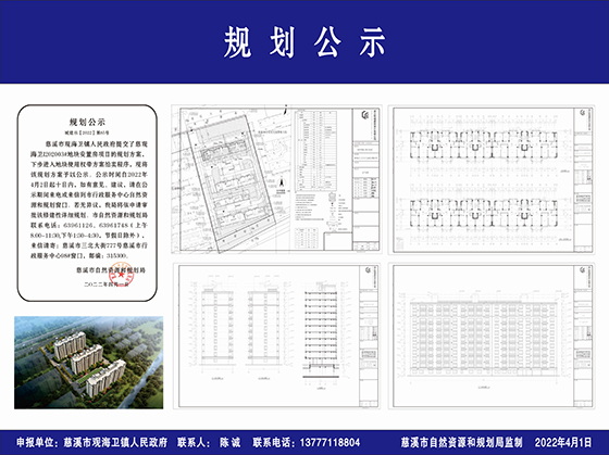 慈溪市观海卫镇人民政府提交了慈观海卫I202003#地块安置房项目的规划方案,下步进入地块使用权带方案拍卖程序,现将该规划方案予以公示。公示时间自2022年4月2日起十日内,如有意见、建议,请在公示期间来电或来信到市行政服务中心自然资源和规划窗口。若无异议,我局将依申请审批该修建性详细规划。市自然资源和规划局联系电话:63961126、63961748(上午8:00-11:30,下午1:30-4:30,节假日除外),来信请寄:慈溪市三北大街777号慈溪市行政服务中心98#窗口,邮编:315300。
