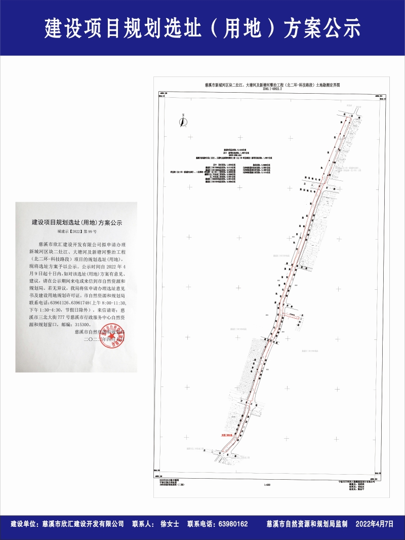 慈溪市欣汇建设开发有限公司拟申请办理新城河区块二灶江、大塘河及新塘河整治工程(北二环-科技路段)项目的规划选址(用地),现将选址方案予以公示。公示时间自2022年4月9日起十日内,如对该选址(用地)方案有意见、建议,请在公示期间来电或来信到市自然资源和规划局。若无异议,我局将依申请办理选址意见书及建设用地规划许可证。市自然资源和规划局联系电话:63961126、63961748(上午8:00-11:30,下午1:30-4:30,节假日除外),来信请寄:慈溪市三北大街777号慈溪市行政服务中心自然资源和规划窗口,邮编:315300。