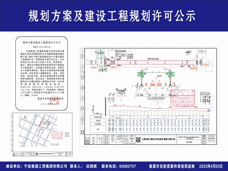 宁波慈溪工贸集团有限公司拟申请办理慈溪市商品市场园区综合开发配套基础设施五期工程-商贸大街北延的规划设计方案及建设工程规划许可,现将规划方案予以公示。公示时间自2022年4月22日起十日内,如有意见、建议,请在公示期间来电或来信到市行政服务中心规划窗口。涉及重大利害关系的,利害关系人如需申请听证,请在公示结束前向我局提出申请,听证申请人须提供姓名、住址、电话号码、身份证号码、签名及证明利害关系等事项的书面材料。若无异议,我局将依申请办理规划设计方案及建设工程规划许可证。市自然资源和规划局联系电话:63961748、63961746(上午8:00-11:30,下午1:30-4:30,节假日除外),来信请寄:慈溪市三北大街777号慈溪市行政服务中心101#窗口,邮编:315300。