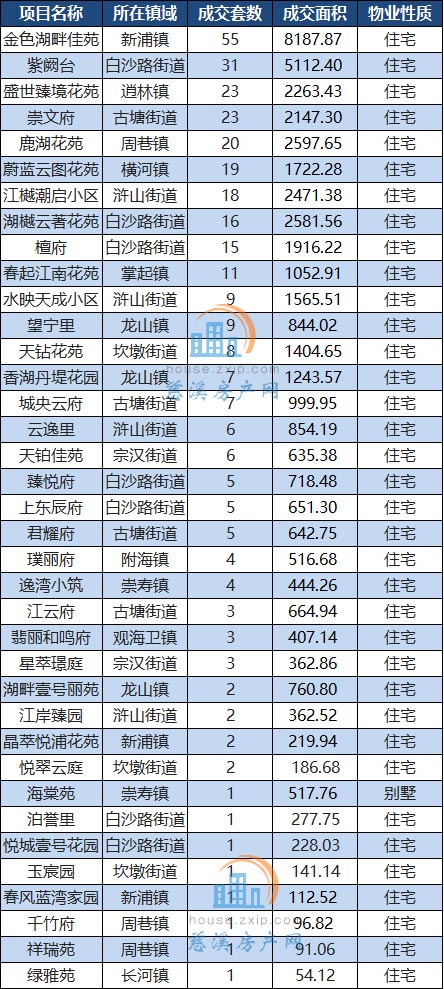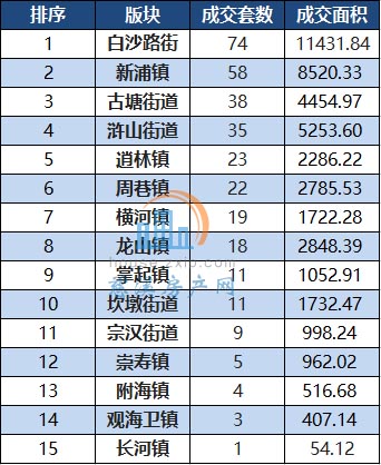 其中,白沙路街道以月成交74套居于榜首,其次是新浦镇以58套的成交量位居第二。