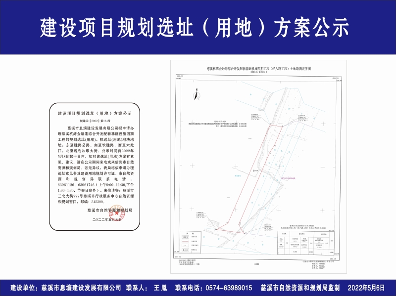 慈溪市息壤建设发展有限公司拟申请办理慈溪杭湾金融港综合开发配套基础设施四期工程的规划选址(用地),拟选址(用地)地块地址:东至胜路公路,南至坎胜路,西至六灶江,北至规划坎墩大街。公示时间自2022年5月8日起十日内,如对该选址(用地)方案有意见、建议,请在公示期间来电或来信到市自然资源和规划局。若无异议,我局将依申请办理选址意见书及建设用地规划许可证。市自然资源和规划局联系电话:63961126、63961746(上午8:00-11:30,下午1:30-4:30,节假日除外),来信请寄:慈溪市三北大街777号慈溪市行政服务中心自然资源和规划窗口,邮编:315300。