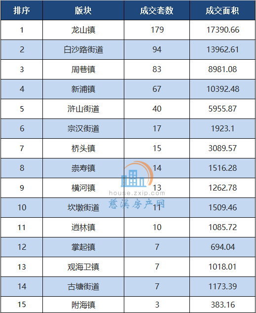 其中,龙山镇以月成交179套居于榜首,其次是白沙路街道以94套的成交量位居第二。