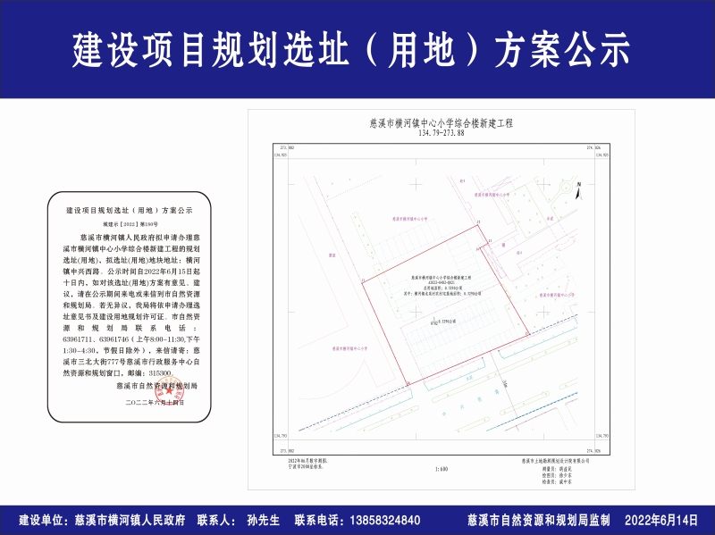 慈溪市横河镇人民政府拟申请办理慈溪市横河镇中心小学综合楼新建工程的规划选址(用地),拟选址(用地)地块地址:横河镇中兴西路。公示时间自2022年6月15日起十日内,如对该选址(用地)方案有意见、建议,请在公示期间来电或来信到市自然资源和规划局。若无异议,我局将依申请办理选址意见书及建设用地规划许可证。市自然资源和规划局联系电话:63961711、63961746(上午8:00-11:30,下午1:30-4:30,节假日除外),来信请寄:慈溪市三北大街777号慈溪市行政服务中心自然资源和规划窗口,邮编:315300。