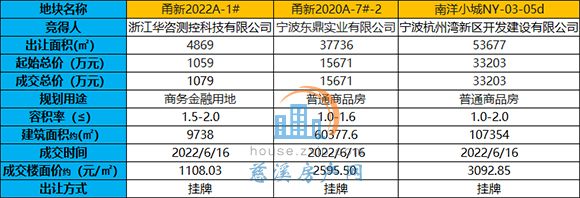 甬新2022A-1#、甬新2020A-7#-2地块、南洋小城NY-03-05d地块竞拍结果
