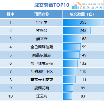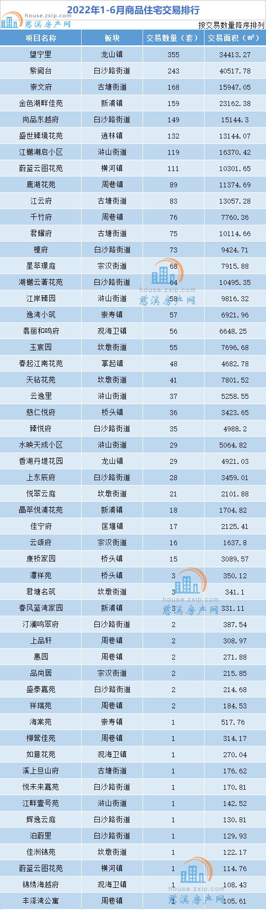 从成交排行榜上看,望宁里以355套的成交量成功夺得2022上半年商品住宅交易数量排行的桂冠,其后的则是位于白沙路街道的紫阙台,以243套的成交量居亚军位置。最后是古塘街道的崇文府以168套的成交量跻身前三甲。