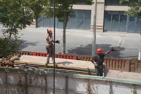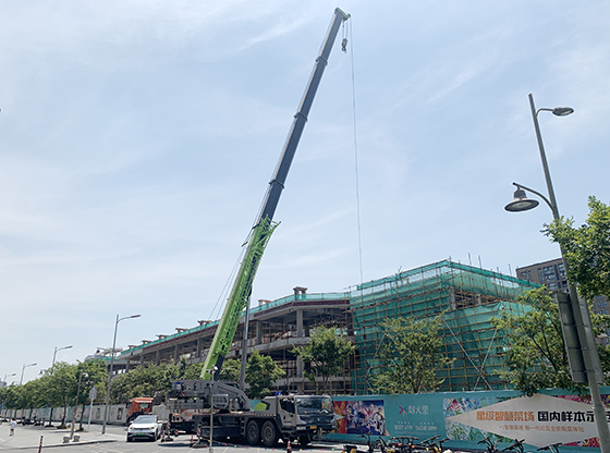 项目全部喜结金顶,工人正在清理建筑物内的剩余石料和废材,目前工程进度已经进行到外墙及内部装修部分,预计于2023年上半年开业。