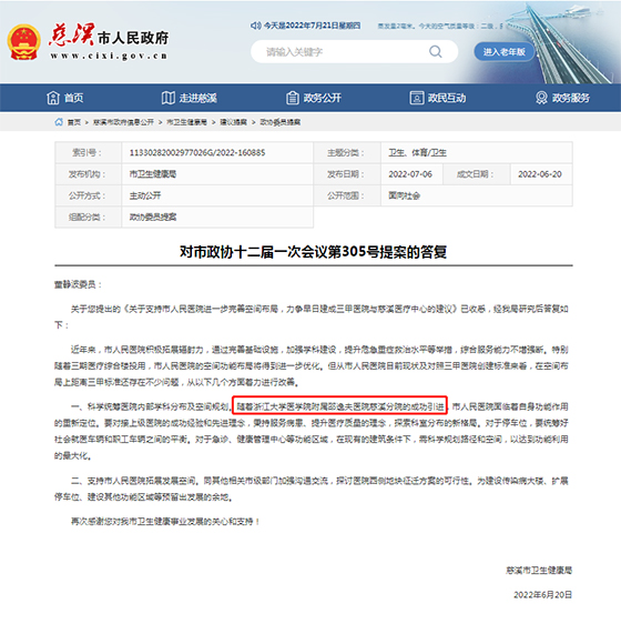 最新官方发布消息:7月6日,慈溪市人民政府官方网站发布信息,对政协305提案的答复中提到随着浙江大学医学院附属邵逸夫医院慈溪分院的成功引进。