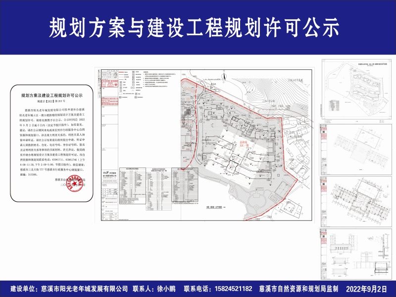 慈溪市阳光老年城发展有限公司拟申请补办慈溪阳光老年城A区一期B楼新增的规划设计方案及建设工程规划许可,现将实测图予以公示。公示时间自2022年9月2日起十日内(法定节假日除外),如有意见、建议,请在公示期间来电或来信到市行政服务中心自然资源和规划窗口。涉及重大利害关系的,利害关系人如需申请听证,请在公示结束前向我局提出申请,听证申请人须提供姓名、住址、电话号码、身份证号码、签名及证明利害关系等事项的书面材料。若无异议,我局将依申请办理规划设计方案及建设工程规划许可证。市自然资源和规划局联系电话:63961711、63961746(上午8:00-11:30,下午2:00-5:00,节假日除外),来信请寄:慈溪市三北大街777号慈溪市行政服务中心规划窗口,邮编:315300。