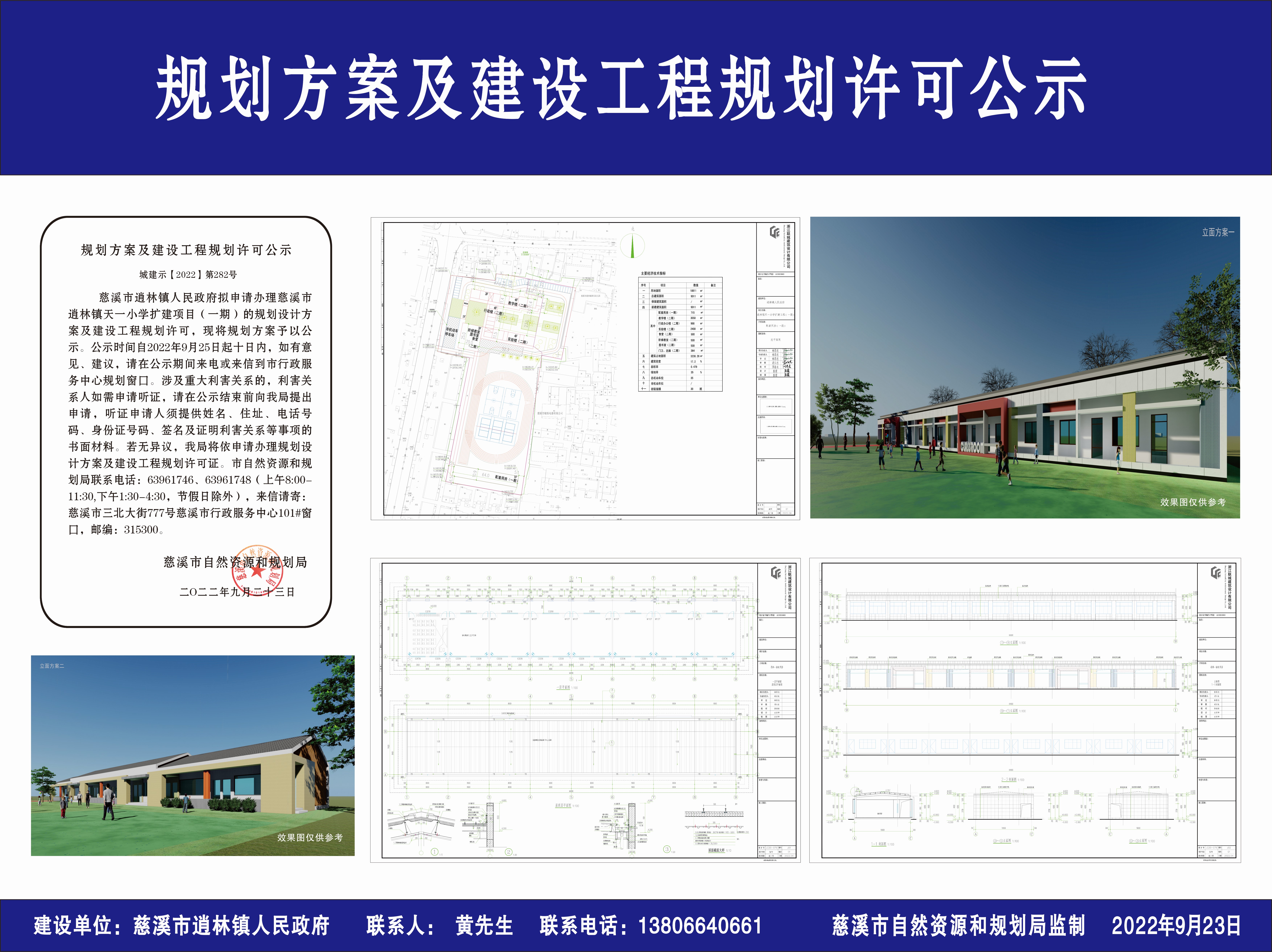 慈溪市逍林镇人民政府拟申请办理慈溪市逍林镇天一小学扩建项目(一期)的规划设计方案及建设工程规划许可,现将规划方案予以公示。公示时间自2022年9月25日起十日内,如有意见、建议,请在公示期间来电或来信到市行政服务中心规划窗口。涉及重大利害关系的,利害关系人如需申请听证,请在公示结束前向我局提出申请,听证申请人须提供姓名、住址、电话号码、身份证号码、签名及证明利害关系等事项的书面材料。若无异议,我局将依申请办理规划设计方案及建设工程规划许可证。市自然资源和规划局联系电话:63961746、63961748(上午8:00-11:30,下午1:30-4:30,节假日除外),来信请寄:慈溪市三北大街777号慈溪市行政服务中心101#窗口,邮编:315300。