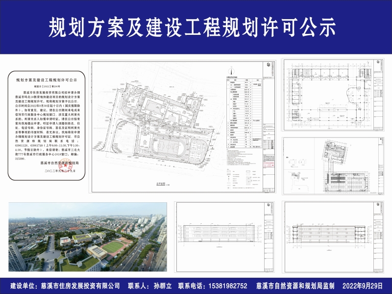 慈溪市住房发展投资有限公司拟申请办理慈溪市鸣北1#教育地块建设项目的规划设计方案及建设工程规划许可,现将规划方案予以公示。公示时间自2022年9月30日起十日内(国庆假期除外),如有意见、建议,请在公示期间来电或来信到市行政服务中心规划窗口。涉及重大利害关系的,利害关系人如需申请听证,请在公示结束前向我局提出申请,听证申请人须提供姓名、住址、电话号码、身份证号码、签名及证明利害关系等事项的书面材料。若无异议,我局将依申请办理规划设计方案及建设工程规划许可证。市自然资源和规划局联系电话:63961126、63961748(上午8:00-11:30,下午1:30-4:30,节假日除外),来信请寄:慈溪市三北大街777号慈溪市行政服务中心101#窗口,邮编:315300。