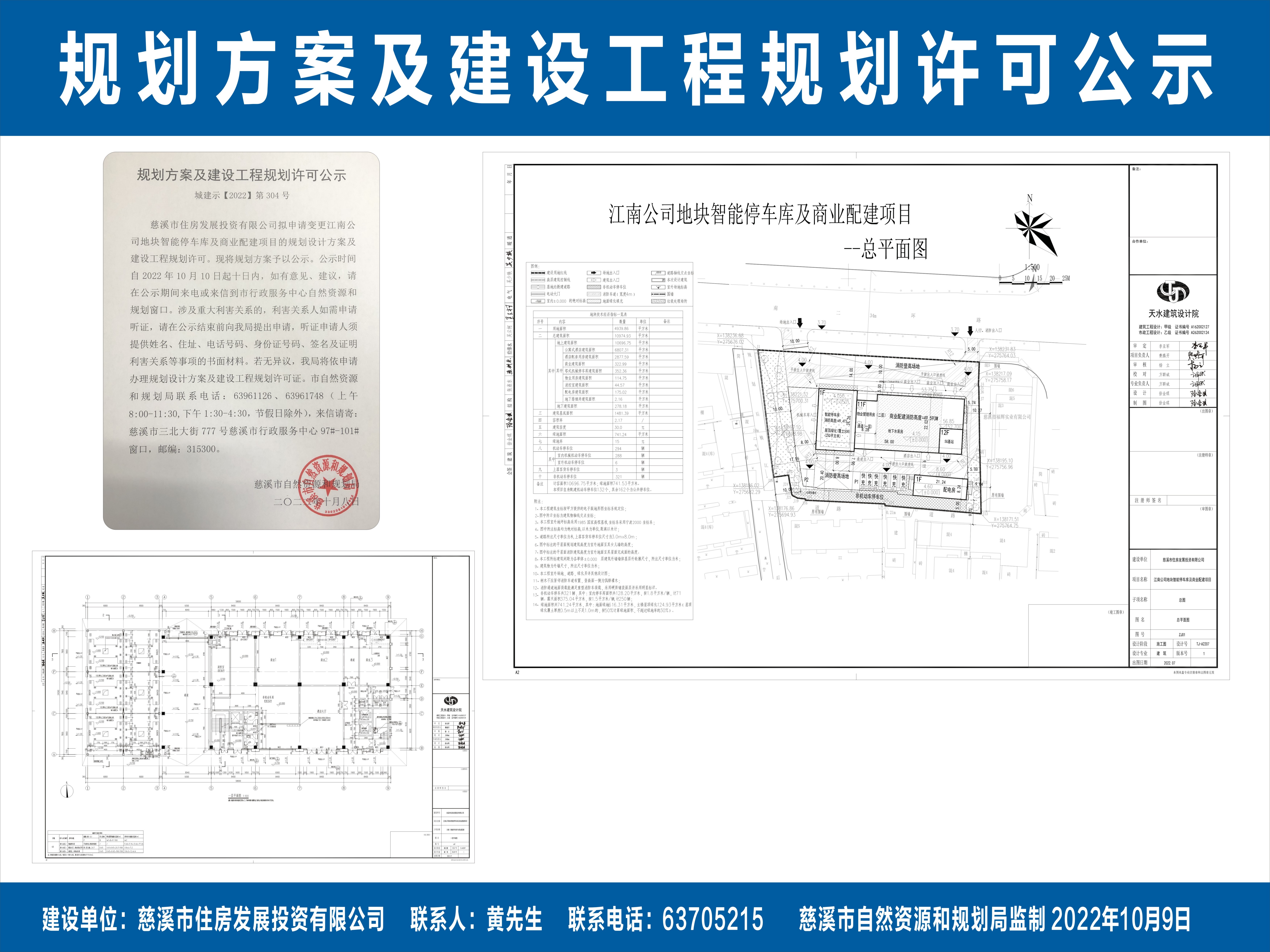 慈溪市住房发展投资有限公司拟申请变更江南公司地块智能停车库及商业配建项目的规划设计方案及建设工程规划许可。现将规划方案予以公示。公示时间自2022年10月10日起十日内,如有意见、建议,请在公示期间来电或来信到市行政服务中心自然资源和规划窗口。涉及重大利害关系的,利害关系人如需申请听证,请在公示结束前向我局提出申请,听证申请人须提供姓名、住址、电话号码、身份证号码、签名及证明利害关系等事项的书面材料。若无异议,我局将依申请办理规划设计方案及建设工程规划许可证。市自然资源和规划局联系电话:63961126、63961748(上午8:00-11:30,下午1:30-4:30,节假日除外),来信请寄:慈溪市三北大街777号慈溪市行政服务中心97#-101#窗口,邮编:315300。