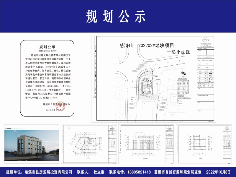 慈溪市住房发展投资有限公司提交了慈浒山I202202#地块项目的规划方案,下步进入地块使用权带方案拍卖程序,现将该规划方案予以公示。公示时间自2022年10月10日起十日内,如有意见、建议,请在公示期间来电或来信到市行政服务中心自然资源和规划窗口。若无异议,我局将依申请审批该修建性详细规划。市自然资源和规划局联系电话:63961126、63961748(上午8:00-11:30,下午1:30-4:30,节假日除外),来信请寄:慈溪市三北大街777号慈溪市行政服务中心98#窗口,邮编:315300。