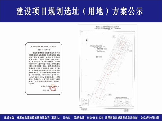 慈溪市息壤建设发展有限公司拟申请办理慈溪杭湾金融港综合开发配套基础设施五期工程的规划选址(用地),拟选址(用地)地块地址:东至东三环路,南至坎墩大街,西至六灶江,北至老三塘横江。公示时间自2022年10月19日起十日内,如对该选址(用地)方案有意见、建议,请在公示期间来电或来信到市自然资源和规划局。若无异议,我局将依申请办理选址意见书及建设用地规划许可证。市自然资源和规划局联系电话:63961711、63961746(上午8:00-11:30,下午1:30-4:30,节假日除外),来信请寄:慈溪市三北大街777号慈溪市行政服务中心自然资源和规划窗口,邮编:315300。