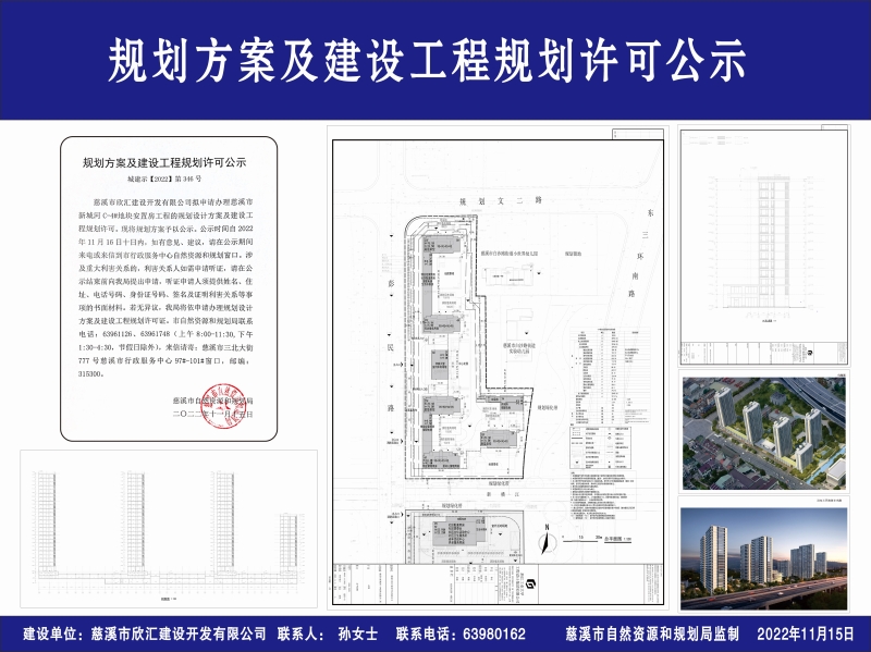 慈溪市欣汇建设开发有限公司拟申请办理慈溪市新城河C-4#地块安置房工程的规划设计方案及建设工程规划许可。现将规划方案予以公示。公示时间自2022年11月16日十日内,如有意见、建议,请在公示期间来电或来信到市行政服务中心自然资源和规划窗口。涉及重大利害关系的,利害关系人如需申请听证,请在公示结束前向我局提出申请,听证申请人须提供姓名、住址、电话号码、身份证号码、签名及证明利害关系等事项的书面材料。若无异议,我局将依申请办理规划设计方案及建设工程规划许可证。市自然资源和规划局联系电话:63961126、63961748(上午8:00-11:30,下午1:30-4:30,节假日除外),来信请寄:慈溪市三北大街777号慈溪市行政服务中心97#-101#窗口,邮编:315300。