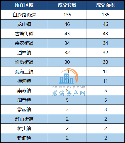 其中,白沙路街道以月成交135套居于榜首,其次是古塘街道以43套的成交量位居第二。