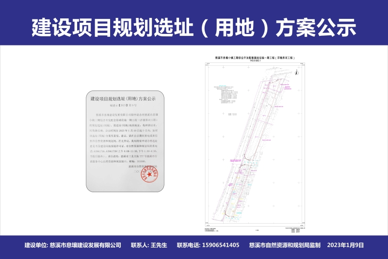 慈溪市息壤建设发展有限公司拟申请办理慈溪市息壤小镇三期综合开发配套基础设施一期工程(洋墩界河工程)的规划选址(用地),拟选址(用地)地块地址:梅林路以东,河角路以南。公示时间自2023年1月10日起十日内,如对该选址(用地)方案有意见、建议,请在公示期间来电或来信到市自然资源和规划局。若无异议,我局将依申请办理选址意见书及建设用地规划许可证。市自然资源和规划局联系电话:63961746、63961739(上午8:00-11:30,下午1:30-4:30,节假日除外),来信请寄:慈溪市三北大街777号慈溪市行政服务中心自然资源和规划窗口,邮编:315300。