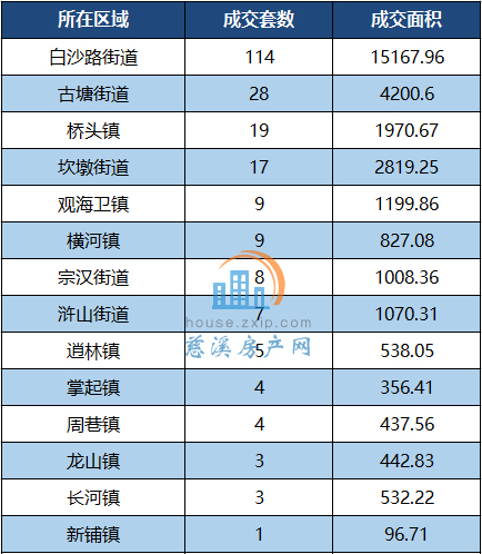 其中,白沙路街道以月成交114套居于榜首,其次是古塘街道以28套的成交量位居第二。