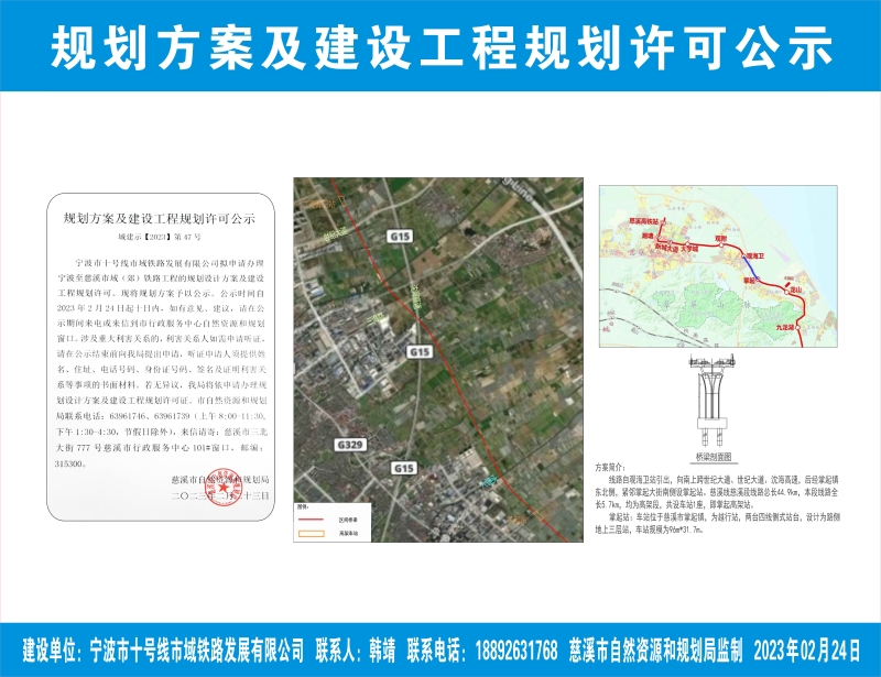 宁波市十号线市域铁路发展有限公司拟申请办理宁波至慈溪市域(郊)铁路工程的规划设计方案及建设工程规划许可。现将规划方案予以公示。公示时间自2023年2月24日起十日内,如有意见、建议,请在公示期间来电或来信到市行政服务中心自然资源和规划窗口。涉及重大利害关系的,利害关系人如需申请听证,请在公示结束前向我局提出申请,听证申请人须提供姓名、住址、电话号码、身份证号码、签名及证明利害关系等事项的书面材料。若无异议,我局将依申请办理规划设计方案及建设工程规划许可证。市自然资源和规划局联系电话:63961746、63961739(上午8:00-11:30,下午1:30-4:30,节假日除外),来信请寄:慈溪市三北大街777号慈溪市行政服务中心101#窗口,邮编:315300。