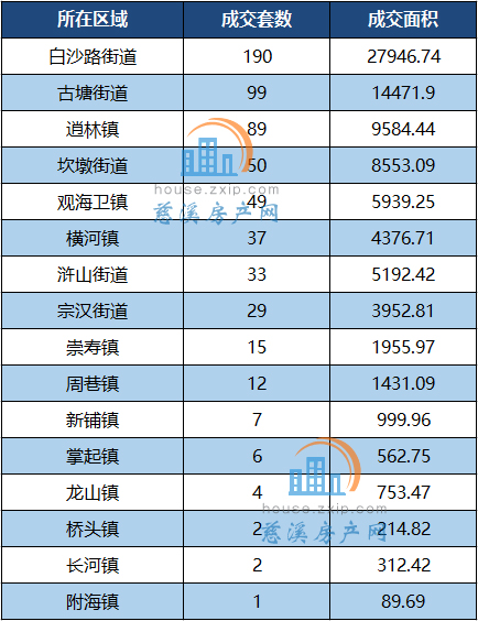 其中,白沙路街道以月成交190套居于榜首,其次是古塘街道以99套的成交量位居第二。