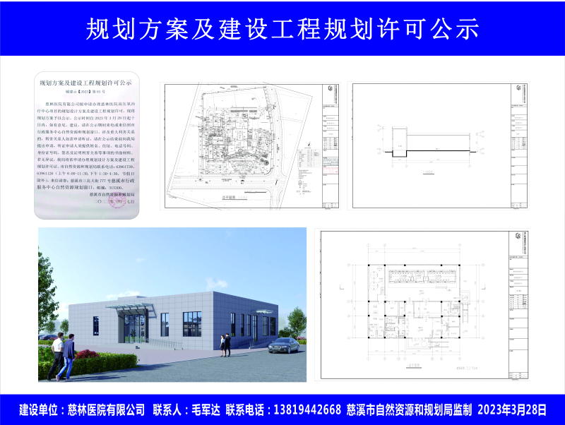 慈林医院有限公司拟申请办理慈林医院高压氧治疗中心项目的规划设计方案及建设工程规划许可。现将规划方案予以公示。公示时间自2023年3月29日起十日内,如有意见、建议,请在公示期间来电或来信到市行政服务中心自然资源和规划窗口。涉及重大利害关系的,利害关系人如需申请听证,请在公示结束前向我局提出申请,听证申请人须提供姓名、住址、电话号码、身份证号码、签名及证明利害关系等事项的书面材料。若无异议,我局将依申请办理规划设计方案及建设工程规划许可证。市自然资源和规划局联系电话:63961739、63961126(上午8:00-11:30,下午1:30-4:30,节假日除外),来信请寄:慈溪市三北大街777号慈溪市行政服务中心自然资源规划窗口,邮编:315300。