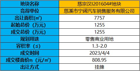 | 慈宗汉I201604#地块 | 7757 | ≤50 | 1.3-2.0 | ≥35 | 商业用地(B1) | 零售商业用地(汽车4S店) | 40年 | 现状 | 1255 | 250 |