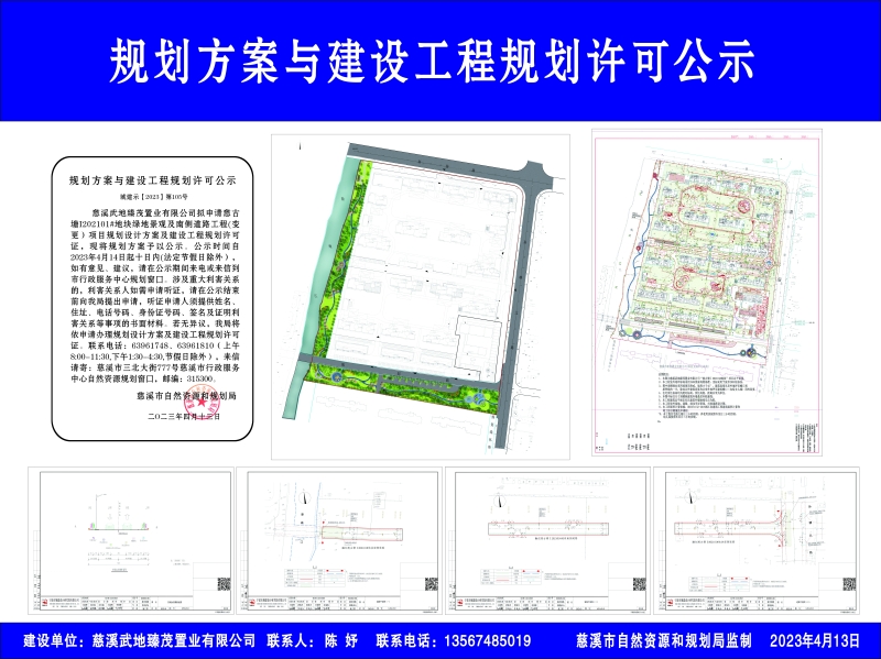 慈溪武地臻茂置业有限公司拟申请慈古塘I202101#地块绿地景观及南侧道路工程(变更)项目规划设计方案及建设工程规划许可证,现将规划方案予以公示。公示时间自2023年4月14日起十日内(法定节假日除外),如有意见、建议,请在公示期间来电或来信到市行政服务中心规划窗口。涉及重大利害关系的,利害关系人如需申请听证,请在公示结束前向我局提出申请,听证申请人须提供姓名、住址、电话号码、身份证号码、签名及证明利害关系等事项的书面材料。若无异议,我局将依申请办理规划设计方案及建设工程规划许可证。联系电话:63961748、63961810(上午8:00-11:30,下午1:30-4:30,节假日除外),来信请寄:慈溪市三北大街777号慈溪市行政服务中心自然资源规划窗口,邮编:315300。