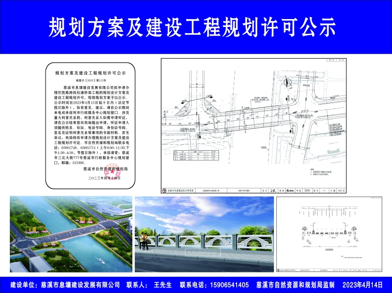 慈溪市息壤建设发展有限公司拟申请办理坎胜路跨四灶浦桥梁工程的规划设计方案及建设工程规划许可,现将规划方案予以公示。公示时间自2023年4月15日起十日内(法定节假日除外),如有意见、建议,请在公示期间来电或来信到市行政服务中心规划窗口。涉及重大利害关系的,利害关系人如需申请听证,请在公示结束前向我局提出申请,听证申请人须提供姓名、住址、电话号码、身份证号码、签名及证明利害关系等事项的书面材料。若无异议,我局将依申请办理规划设计方案及建设工程规划许可证。市自然资源和规划局联系电话:63961748、63961711(上午8:00-11:30,下午1:30-4:30,节假日除外),来信请寄:慈溪市三北大街777号慈溪市行政服务中心规划窗口,邮编:315300。