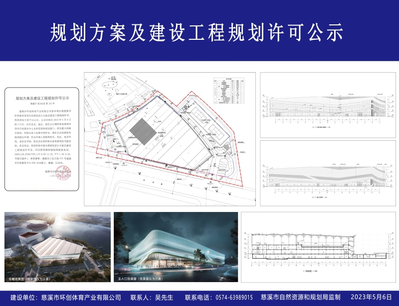 慈溪市环创体育产业有限公司拟申请办理慈溪市体育健身馆项目的规划设计方案及建设工程规划许可,现将规划方案予以公示。公示时间自2023年5月8日起十日内,如有意见、建议,请在公示期间来电或来信到市行政服务中心自然资源和规划窗口。涉及重大利害关系的,利害关系人如需申请听证,请在公示结束前向我局提出申请,听证申请人须提供姓名、住址、电话号码、身份证号码、签名及证明利害关系等事项的书面材料。若无异议,我局将依申请办理规划设计方案及建设工程规划许可证。市自然资源和规划局联系电话:63961126、63961739(上午8:00-11:30,下午1:30-4:30,节假日除外),来信请寄:慈溪市三北大街777号慈溪市行政服务中心97#-101#窗口,邮编:315300。