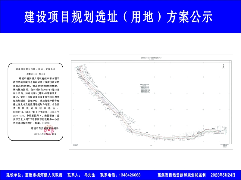 慈溪市横河镇人民政府拟申请办理宁波市慈溪市横河片美丽河湖片区建设项目的规划选址(用地),拟选址(用地)地块地址:横河镇梅园村。公示时间自2023年5月25日起十日内,如对该选址(用地)方案有意见、建议,请在公示期间来电或来信到市自然资源和规划局。若无异议,我局将依申请办理选址意见书及建设用地规划许可证。市自然资源和规划局联系电话:63961711、63961746(上午8:00-11:30,下午1:30-4:30,节假日除外),来信请寄:慈溪市三北大街777号慈溪市行政服务中心自然资源和规划窗口,邮编:315300。