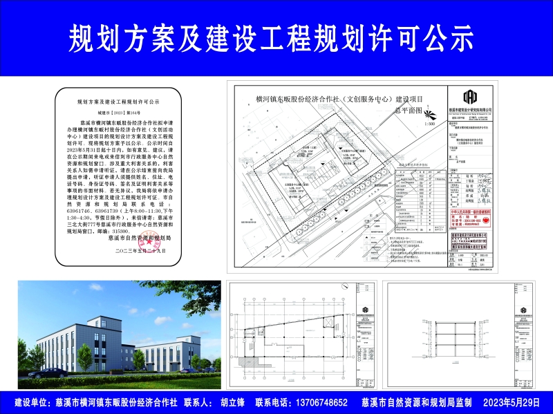 慈溪市横河镇东畈股份经济合作社拟申请办理横河镇东畈村股份经济合作社(文创活动中心)建设项目的规划设计方案及建设工程规划许可。现将规划方案予以公示。公示时间自2023年5月31日起十日内,如有意见、建议,请在公示期间来电或来信到市行政服务中心自然资源和规划窗口。涉及重大利害关系的,利害关系人如需申请听证,请在公示结束前向我局提出申请,听证申请人须提供姓名、住址、电话号码、身份证号码、签名及证明利害关系等事项的书面材料。若无异议,我局将依申请办理规划设计方案及建设工程规划许可证。市自然资源和规划局联系电话:63961746、63961739(上午8:00-11:30,下午1:30-4:30,节假日除外),来信请寄:慈溪市三北大街777号慈溪市行政服务中心自然资源和规划局窗口,邮编:315300。