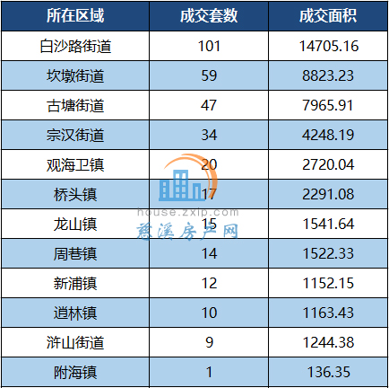 其中,白沙路街道以月成交101套居于榜首,其次是坎墩街道以59套的成交量位居第二。