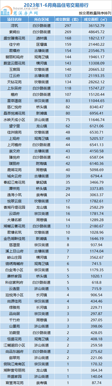 从成交排行榜上看,位于白沙路街道的浔筑以297套的成交量成功夺得2023上半年商品住宅交易数量排行的桂冠,其后的则是位于白沙路街道的紫阙台,以269套的成交量居亚军位置。最后是逍林镇的盛世臻境花苑以168套的成交量跻身前三甲。