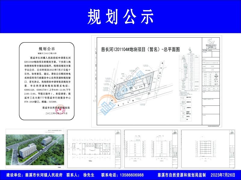慈溪市长河镇人民政府拟申请慈长河I201104#地块项目的规划方案,下步进入地块使用权带方案拍卖程序,现将该规划方案予以公示。公示时间自2023年7月27日起十日内,如有意见、建议,请在公示期间来电或来信到市行政服务中心自然资源和规划窗口。若无异议,我局将依申请审批该规划方案。市自然资源和规划局联系电话:63961126、63961739(上午8:00-11:30,下午2:00-5:00,节假日除外),来信请寄:慈溪市三北大街777号慈溪市行政服务中心97#-101#窗口,邮编:315300。