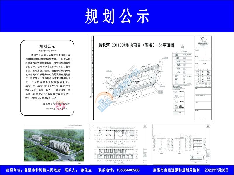慈溪市长河镇人民政府拟申请慈长河I201103#地块项目的规划方案,下步进入地块使用权带方案拍卖程序,现将该规划方案予以公示。公示时间自2023年7月27日起十日内,如有意见、建议,请在公示期间来电或来信到市行政服务中心自然资源和规划窗口。若无异议,我局将依申请审批该规划方案。市自然资源和规划局联系电话:63961126、63961739(上午8:00-11:30,下午2:00-5:00,节假日除外),来信请寄:慈溪市三北大街777号慈溪市行政服务中心97#-101#窗口,邮编:315300。