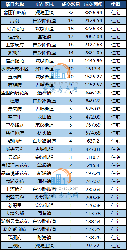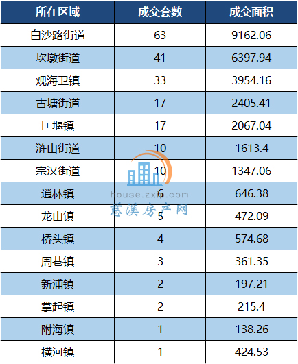 其中,白沙路街道以月成交63套居于榜首,其次是坎墩街道以41套的成交量位居第二。