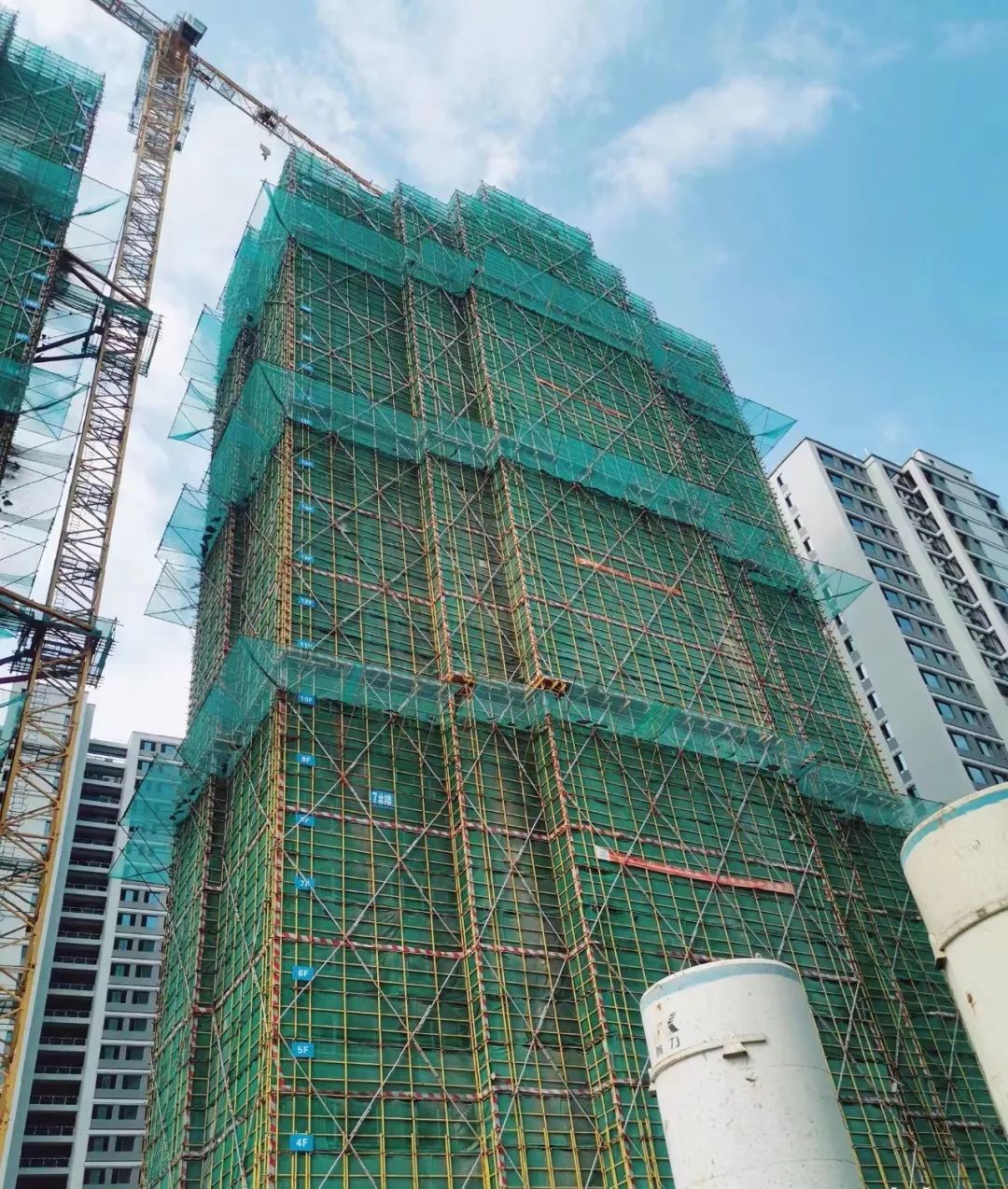 4#楼主体已封顶,二次结构、砌体完成、内外墙粉刷完成;地坪完成;涂料成品已到后期;铝合金窗玻璃安装已到后期,外脚手架拆除完成。