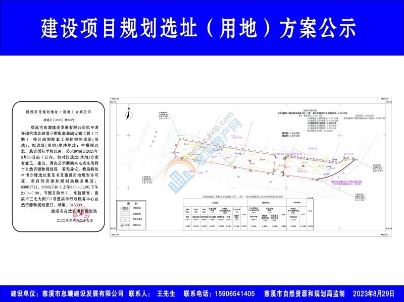 慈溪市息壤建设发展有限公司拟申请办理杭湾金融港三期配套基础设施工程(二期)-校区南侧配套工程的规划选址(用地),拟选址(用地)地块地址:中横线以北、慈吉国际学校以南。公示时间自2023年8月30日起十日内,如对该选址(用地)方案有意见、建议,请在公示期间来电或来信到市自然资源和规划局。若无异议,我局将依申请办理选址意见书及建设用地规划许可证。市自然资源和规划局联系电话:63961711、63961746(上午8:00-11:30,下午2:00-5:00,节假日除外),来信请寄:慈溪市三北大街777号慈溪市行政服务中心自然资源和规划窗口,邮编:315300。