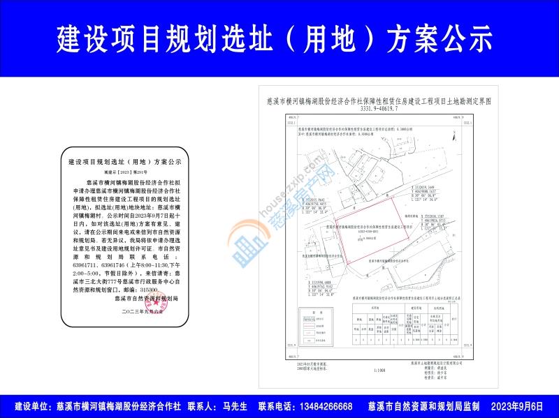 慈溪市横河镇梅湖股份经济合作社拟申请办理慈溪市横河镇梅湖股份经济合作社保障性租赁住房建设工程项目的规划选址(用地),拟选址(用地)地块地址:慈溪市横河镇梅湖村。公示时间自2023年9月7日起十日内,如对该选址(用地)方案有意见、建议,请在公示期间来电或来信到市自然资源和规划局。若无异议,我局将依申请办理选址意见书及建设用地规划许可证。市自然资源和规划局联系电话:63961711、63961746(上午8:00-11:30,下午2:00-5:00,节假日除外),来信请寄:慈溪市三北大街777号慈溪市行政服务中心自然资源和规划窗口,邮编:315300。