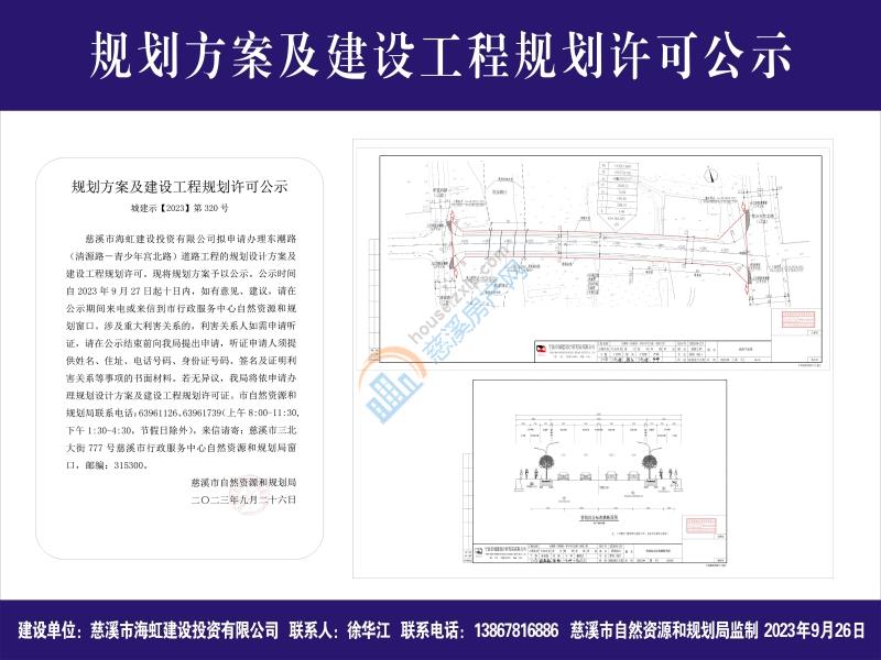 慈溪市海虹建设投资有限公司拟申请办理东潮路(清源路-青少年宫北路)道路工程的规划设计方案及建设工程规划许可。现将规划方案予以公示。公示时间自2023年9月27日起十日内,如有意见、建议,请在公示期间来电或来信到市行政服务中心自然资源和规划窗口。涉及重大利害关系的,利害关系人如需申请听证,请在公示结束前向我局提出申请,听证申请人须提供姓名、住址、电话号码、身份证号码、签名及证明利害关系等事项的书面材料。若无异议,我局将依申请办理规划设计方案及建设工程规划许可证。市自然资源和规划局联系电话:63961126、63961739(上午8:00-11:30,下午1:30-4:30,节假日除外),来信请寄:慈溪市三北大街777号慈溪市行政服务中心自然资源和规划局窗口,邮编:315300。