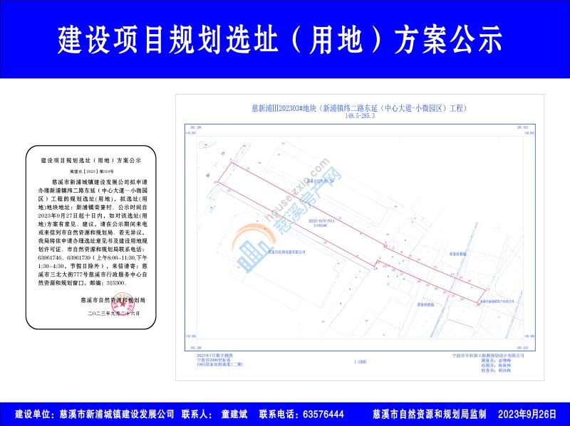 慈溪市新浦城镇建设发展公司拟申请办理新浦镇纬二路东延(中心大道—小微园区)工程的规划选址(用地),拟选址(用地)地块地址:新浦镇荣誉村。公示时间自2023年9月27日起十日内,如对该选址(用地)方案有意见、建议,请在公示期间来电或来信到市自然资源和规划局。若无异议,我局将依申请办理选址意见书及建设用地规划许可证。市自然资源和规划局联系电话:63961746、63961739(上午8:00-11:30,下午1:30-4:30,节假日除外),来信请寄:慈溪市三北大街777号慈溪市行政服务中心自然资源和规划窗口,邮编:315300。