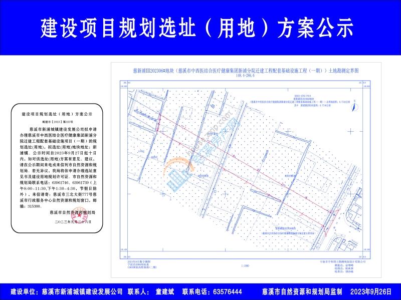 慈溪市新浦城镇建设发展公司拟申请办理慈溪市中西医结合医疗健康集团新浦分院迁建工程配套基础设施项目(一期)的规划选址(用地),拟选址(用地)地块地址:新浦镇。公示时间自2023年9月27日起十日内,如对该选址(用地)方案有意见、建议,请在公示期间来电或来信到市自然资源和规划局。若无异议,我局将依申请办理选址意见书及建设用地规划许可证。市自然资源和规划局联系电话:63961746、63961739(上午8:00-11:30,下午1:30-4:30,节假日除外),来信请寄:慈溪市三北大街777号慈溪市行政服务中心自然资源和规划窗口,邮编:315300。