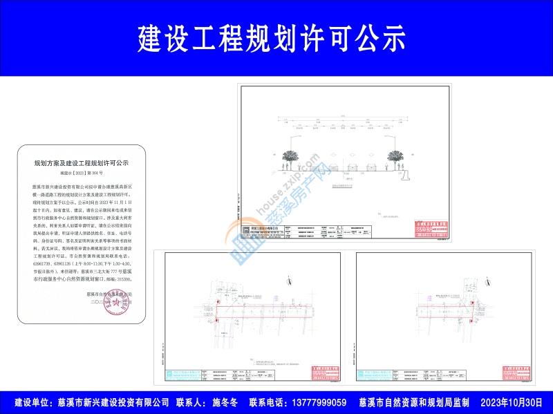 慈溪市新兴建设投资有限公司拟申请办理慈溪高新区横一路道路工程的规划设计方案及建设工程规划许可。现将规划方案予以公示。公示时间自2023年11月1日起十日内,如有意见、建议,请在公示期间来电或来信到市行政服务中心自然资源和规划窗口。涉及重大利害关系的,利害关系人如需申请听证,请在公示结束前向我局提出申请,听证申请人须提供姓名、住址、电话号码、身份证号码、签名及证明利害关系等事项的书面材料。若无异议,我局将依申请办理规划设计方案及建设工程规划许可证。市自然资源和规划局联系电话:63961739、63961126(上午8:00-11:30,下午1:30-4:30,节假日除外),来信请寄:慈溪市三北大街777号慈溪市行政服务中心自然资源规划窗口,邮编:315300。