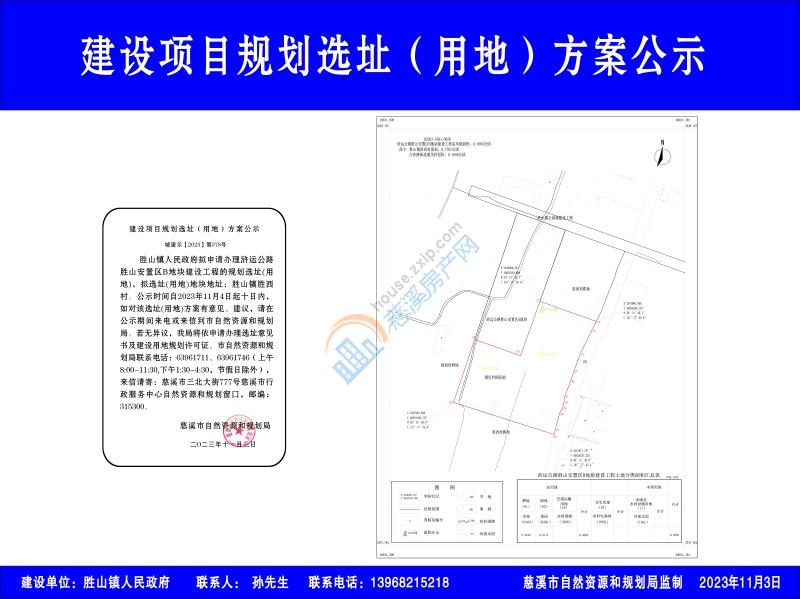 胜山镇人民政府拟申请办理浒运公路胜山安置区B地块建设工程的规划选址(用地),拟选址(用地)地块地址:胜山镇胜西村。公示时间自2023年11月4日起十日内,如对该选址(用地)方案有意见、建议,请在公示期间来电或来信到市自然资源和规划局。若无异议,我局将依申请办理选址意见书及建设用地规划许可证。市自然资源和规划局联系电话:63961711、63961746(上午8:00-11:30,下午1:30-4:30,节假日除外),来信请寄:慈溪市三北大街777号慈溪市行政服务中心自然资源和规划窗口,邮编:315300。