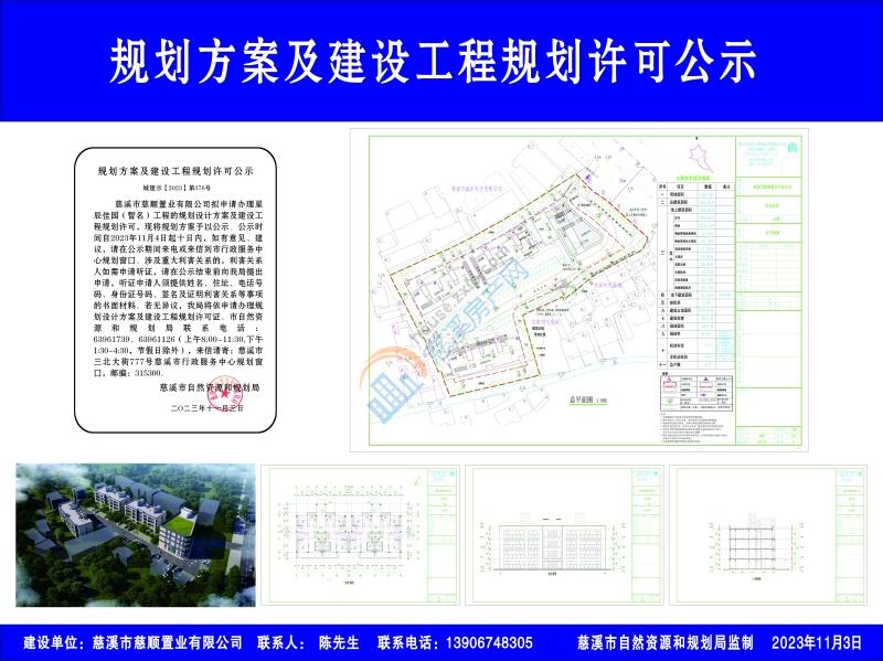 慈溪市慈顺置业有限公司拟申请办理星辰佳园(暂名)工程的规划设计方案及建设工程规划许可,现将规划方案予以公示。公示时间自2023年11月4日起十日内,如有意见、建议,请在公示期间来电或来信到市行政服务中心规划窗口。涉及重大利害关系的,利害关系人如需申请听证,请在公示结束前向我局提出申请,听证申请人须提供姓名、住址、电话号码、身份证号码、签名及证明利害关系等事项的书面材料。若无异议,我局将依申请办理规划设计方案及建设工程规划许可证。市自然资源和规划局联系电话:63961739、63961126(上午8:00-11:30,下午1:30-4:30,节假日除外),来信请寄:慈溪市三北大街777号慈溪市行政服务中心规划窗口,邮编:315300。