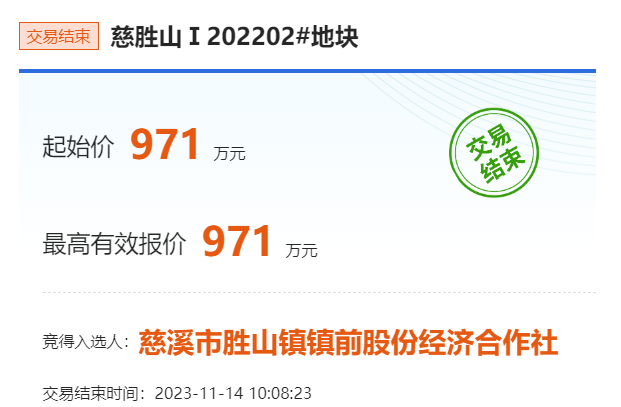 10时04分,限时竞价开始!最终,慈溪市胜山镇镇前股份经济合作社以成交总价971万元竞得该地块,成交楼面价约1138元/平。