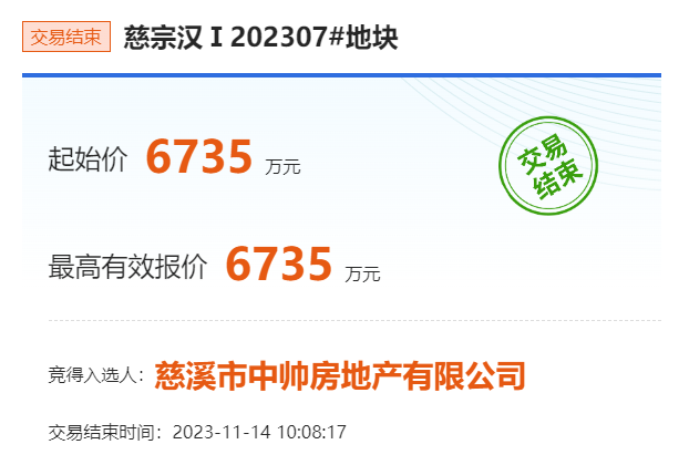 总价6735万元!慈溪市中帅房地产有限公司竞得该地块