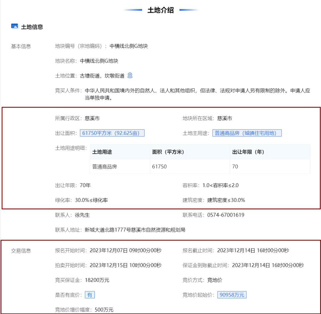 出让面积61750m²(折合92.625亩);1.0≤容积率≤2.0;建筑密度≤30%;绿地率≥30%,允许配建计容建筑面积小于总计容建筑面积10%的配建设施及商业用房;建筑高度:居住27-54米,沿街商业裙房以2层为主。拍卖起始价90958万元,竞买保证金18200万元,土地用途为城镇住宅用地。(注:出让宗地面积以实测为准。详细规划要求以出让宗地的《规划条件通知书》为准。)