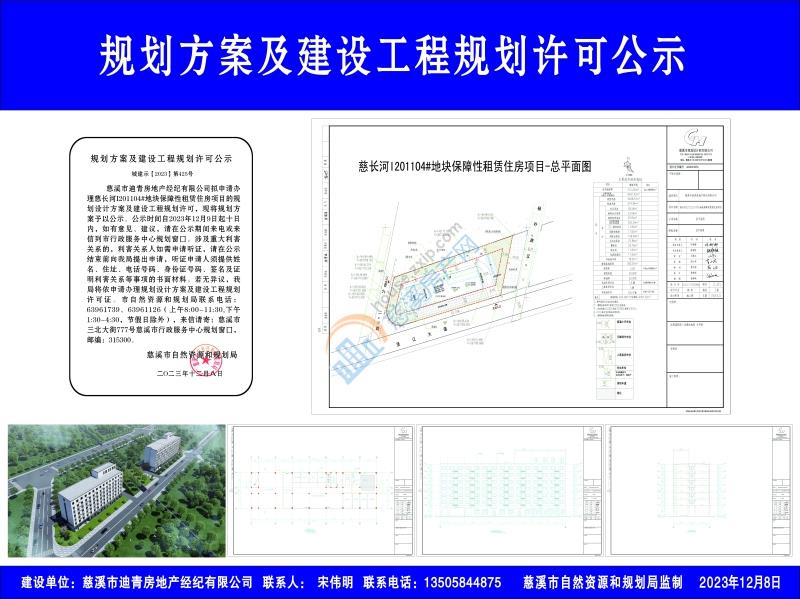 慈溪市迪青房地产经纪有限公司拟申请办理慈长河I201104#地块保障性租赁住房项目的规划设计方案及建设工程规划许可,现将规划方案予以公示。公示时间自2023年12月9日起十日内,如有意见、建议,请在公示期间来电或来信到市行政服务中心规划窗口。涉及重大利害关系的,利害关系人如需申请听证,请在公示结束前向我局提出申请,听证申请人须提供姓名、住址、电话号码、身份证号码、签名及证明利害关系等事项的书面材料。若无异议,我局将依申请办理规划设计方案及建设工程规划许可证。市自然资源和规划局联系电话:63961739、63961126(上午8:00-11:30,下午1:30-4:30,节假日除外),来信请寄:慈溪市三北大街777号慈溪市行政服务中心规划窗口,邮编:315300。